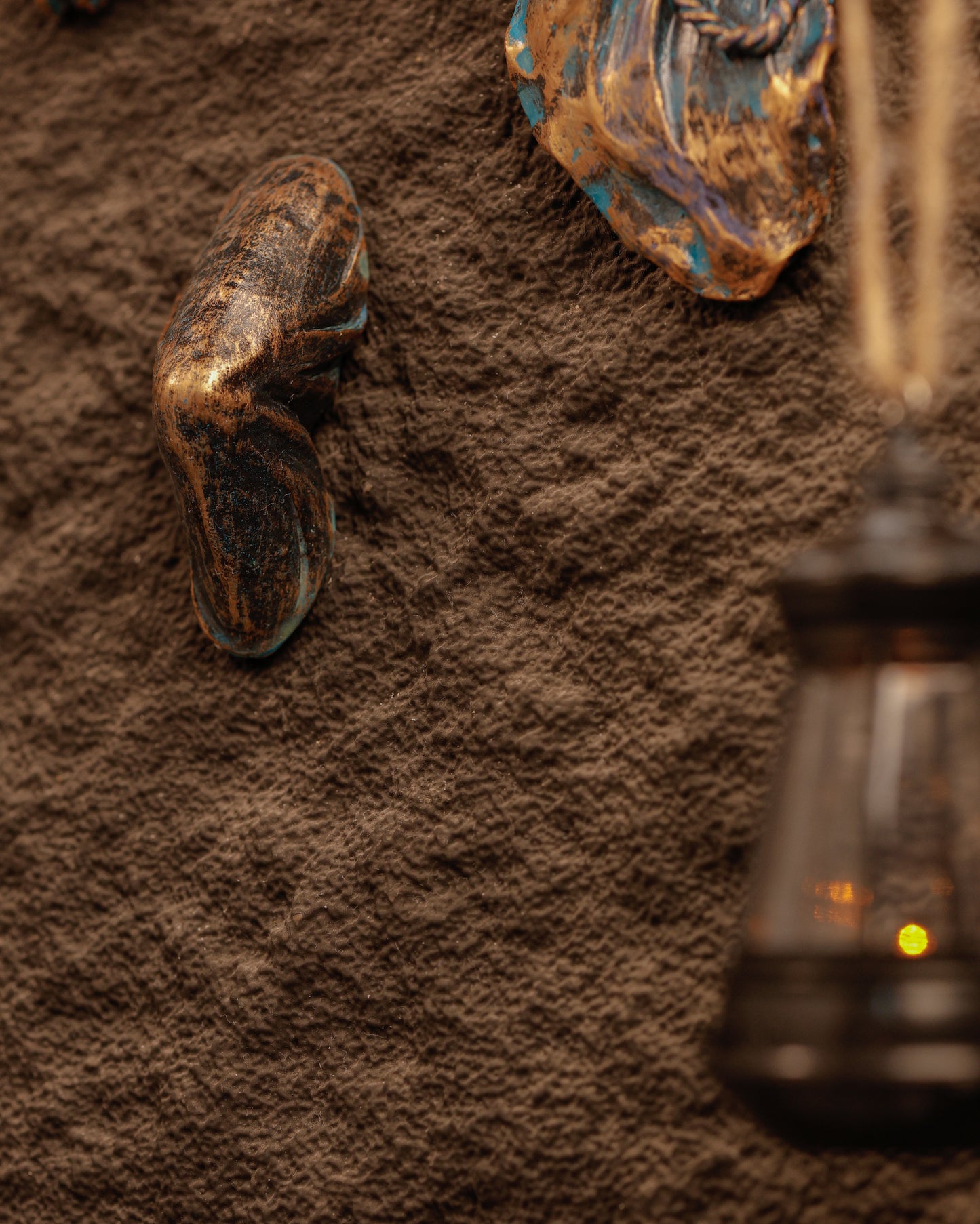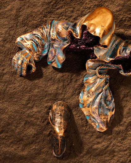 Detailed in gold, black, and patina blue tones to give a weathered, haunted aesthetic. -