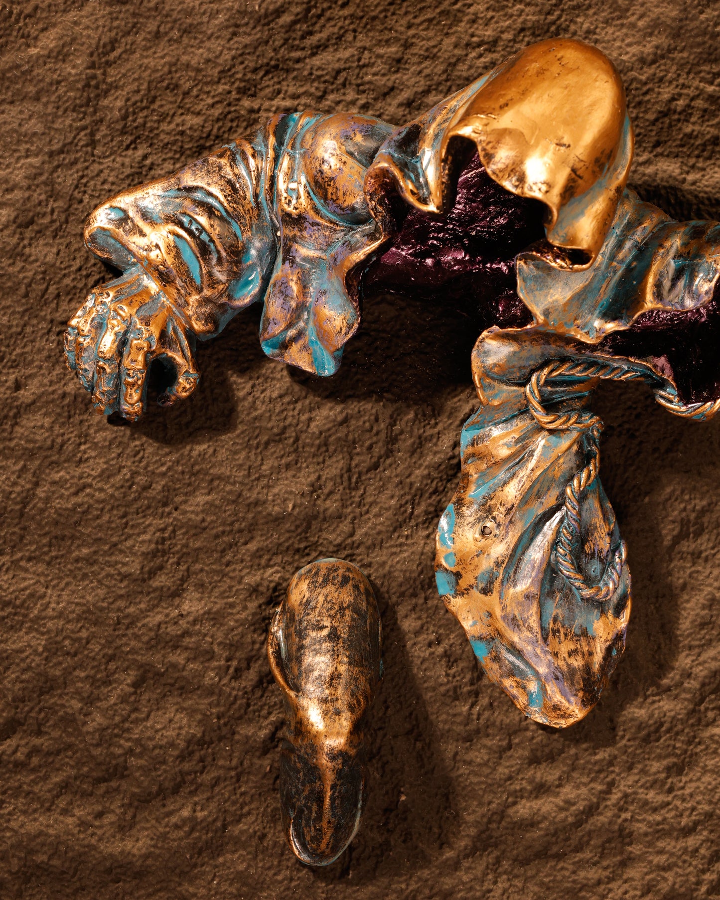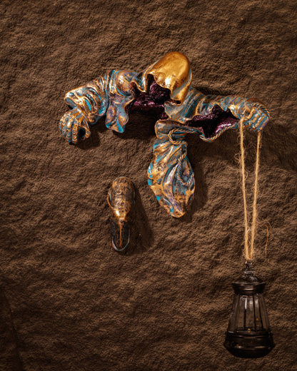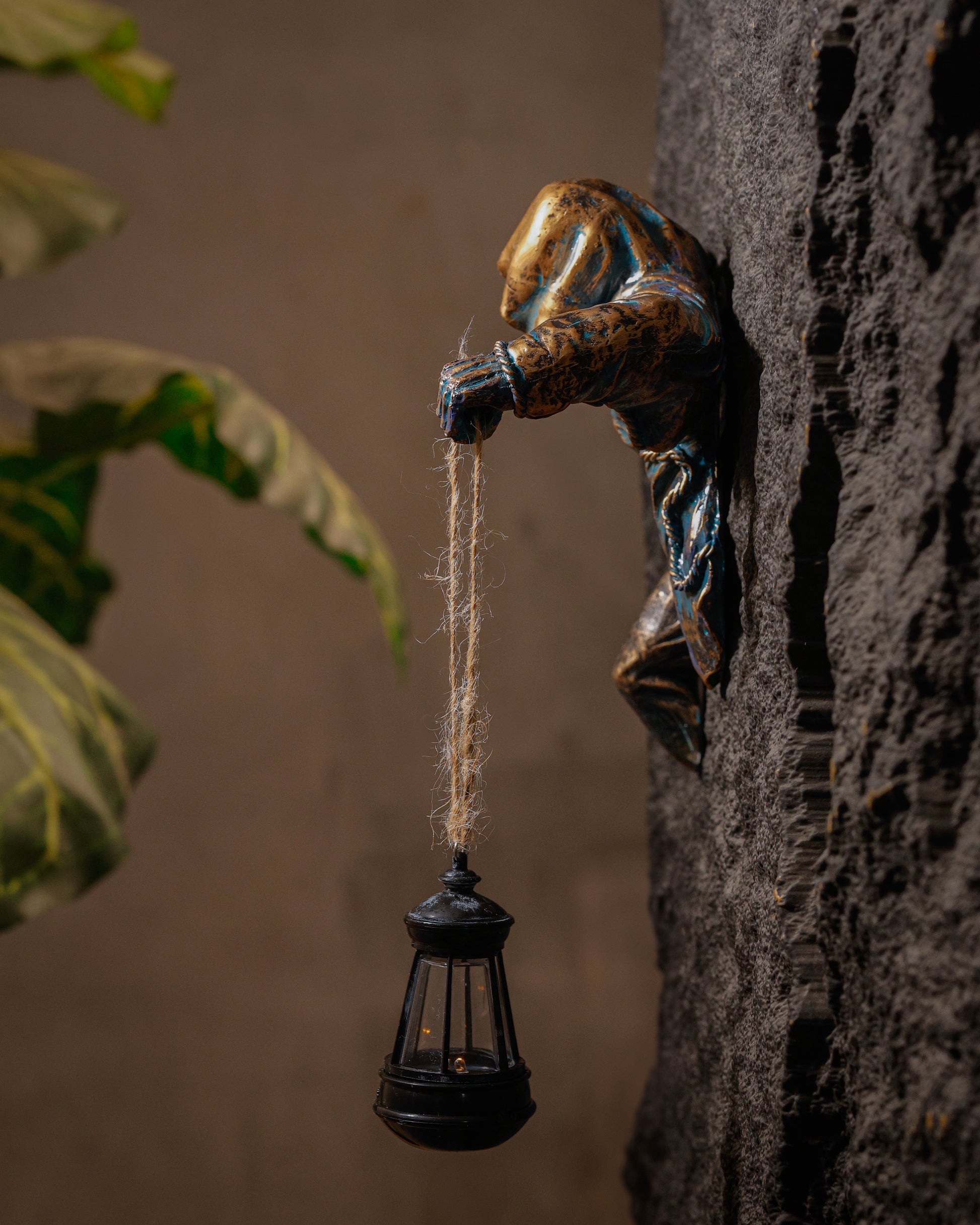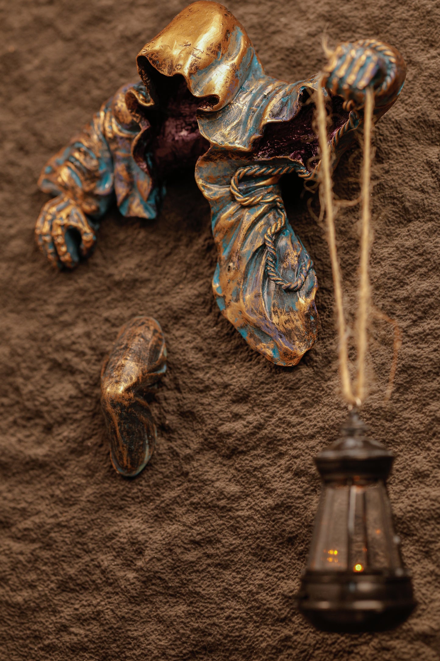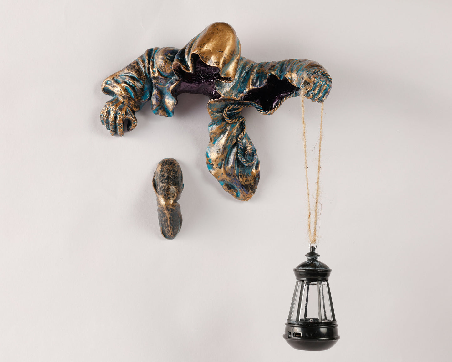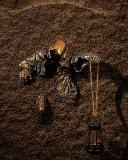 Step into the shadows with this eerie and captivating wall sculpture. The Haunted Hooded Reaper Wall Lamp brings an ominous presence to your space, featuring a ghostly cloaked figure emerging from your wall with a lantern dangling ominously from its hand. Finished in antique gold and patina blue with a hollow, faceless hood, this piece is perfect for gothic decor lovers, fantasy fans, or anyone looking to add a dramatic, otherworldly vibe to their interior.